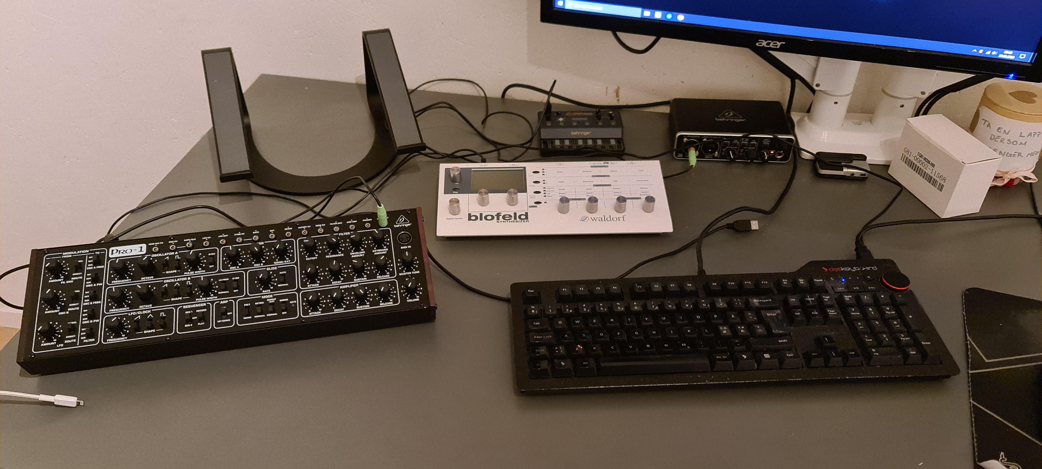 > KRK Rokit 5 monitors> Scarlett 2i2 interface > Various MIDI cables [LIST TRUNCATED...] |